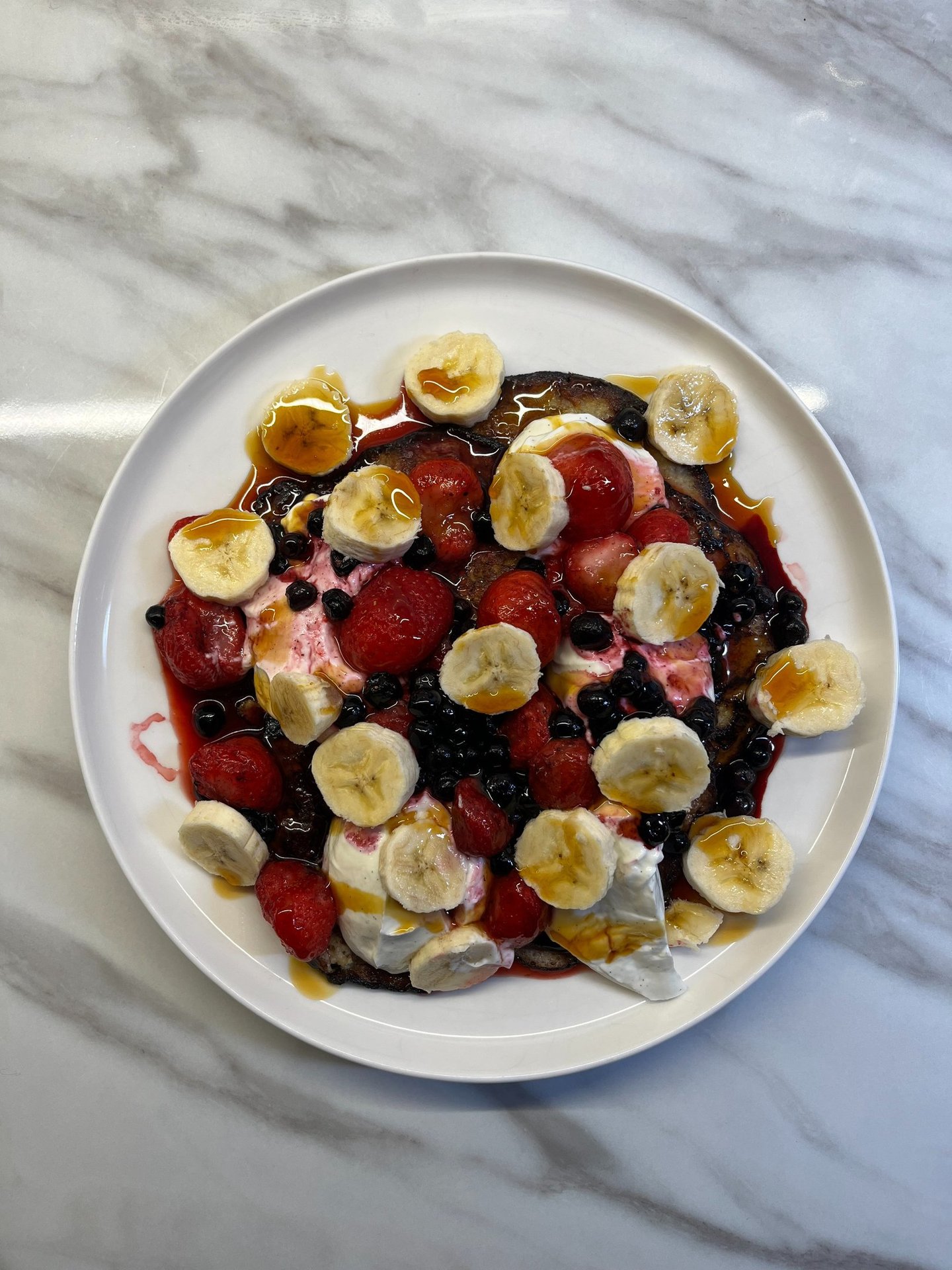 Top the pancakes with vanilla skyr, berries, and maple syrup.